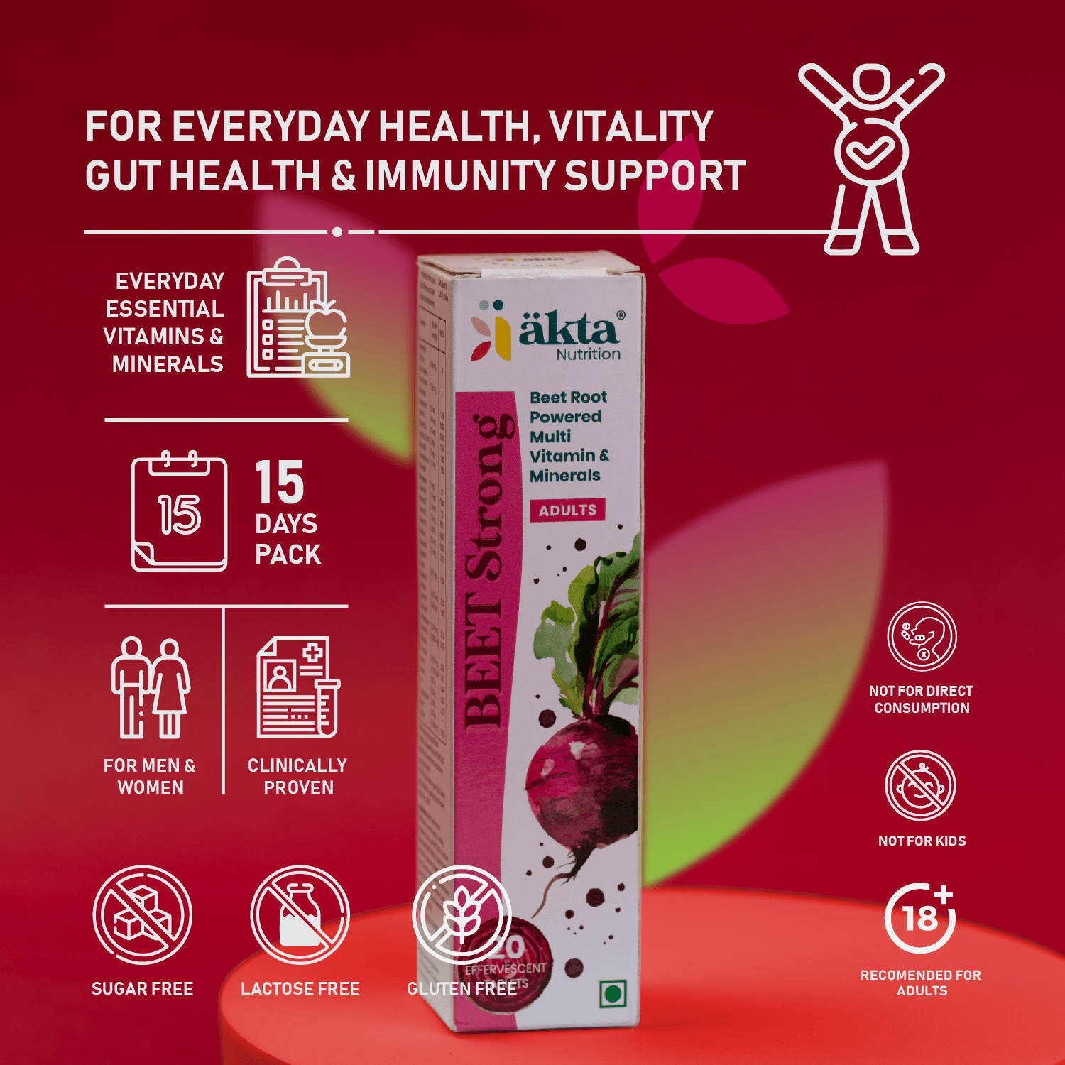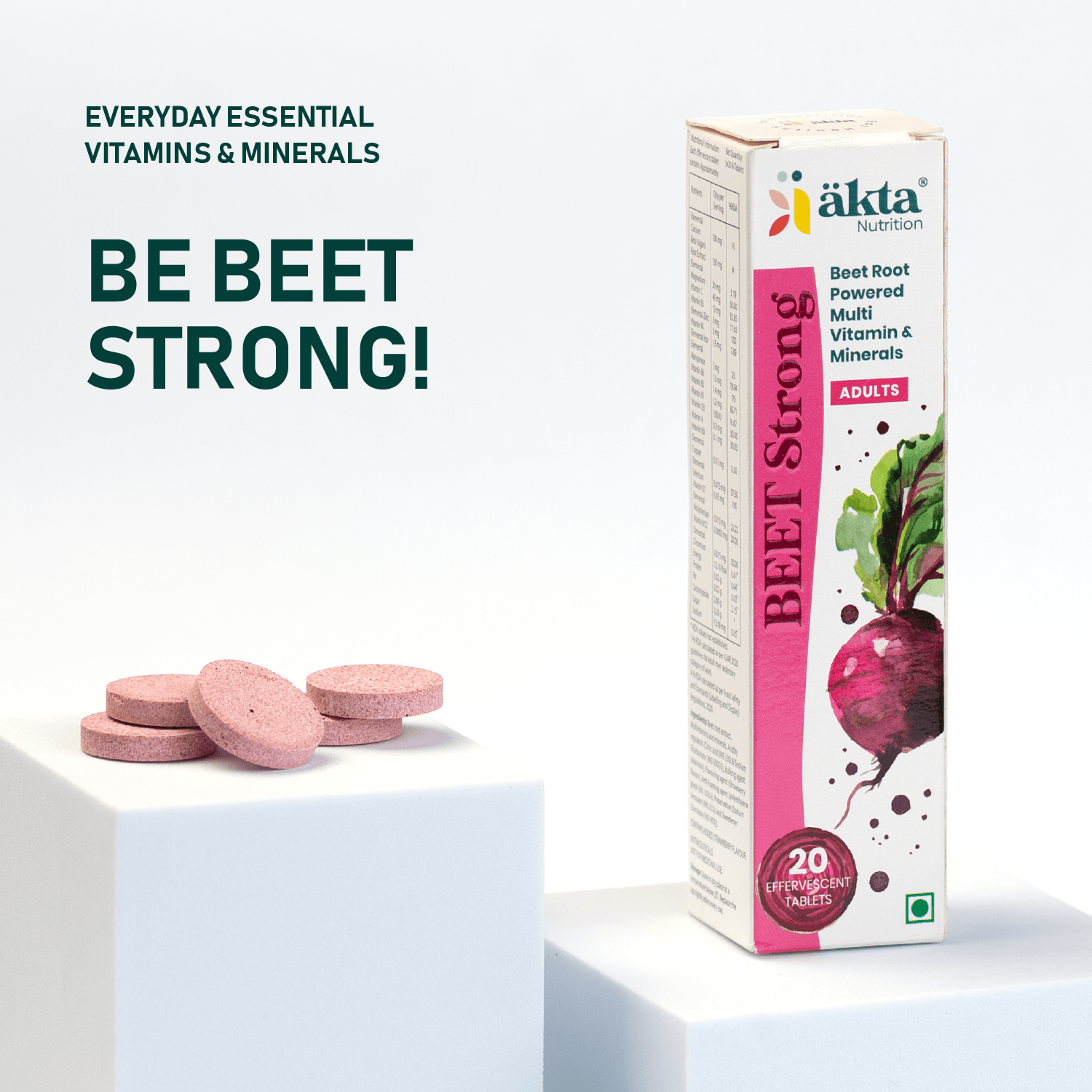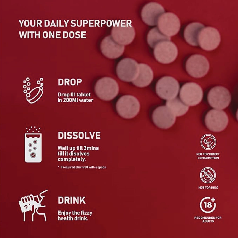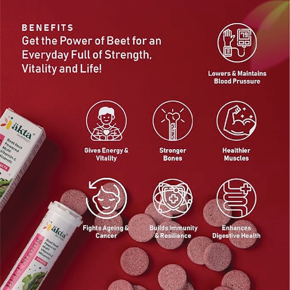 Beet-Strong's multivitamin effervescent tablets are packed with essential vitamins that support overall health and wellness. Vitamin C boosts immune function and skin health, while B vitamins (B1, B2, B3, B5, B6, B7, B9, and B12) enhance energy production, cognitive function, and maintain healthy skin, hair, and nails. Vitamin D3 promotes strong bones and immune health, and Vitamin A is crucial for good vision, immune function, and skin health. Together, these vitamins provide comprehensive nutritional support, helping you stay energized, focused, and resilient.